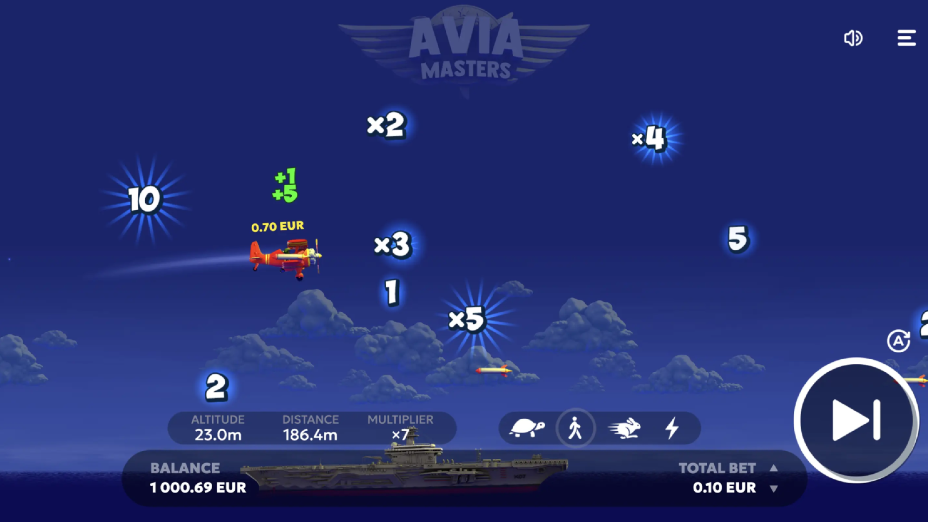 At the start of the game, you’ll need to choose your bet level. Then, select the speed at which you want the plane to fly. There are four speeds. The turtle is the slowest, while the lighting bolt is the quickest. Check the settings and start the game. The plane will take off, collecting rewards as it flies.